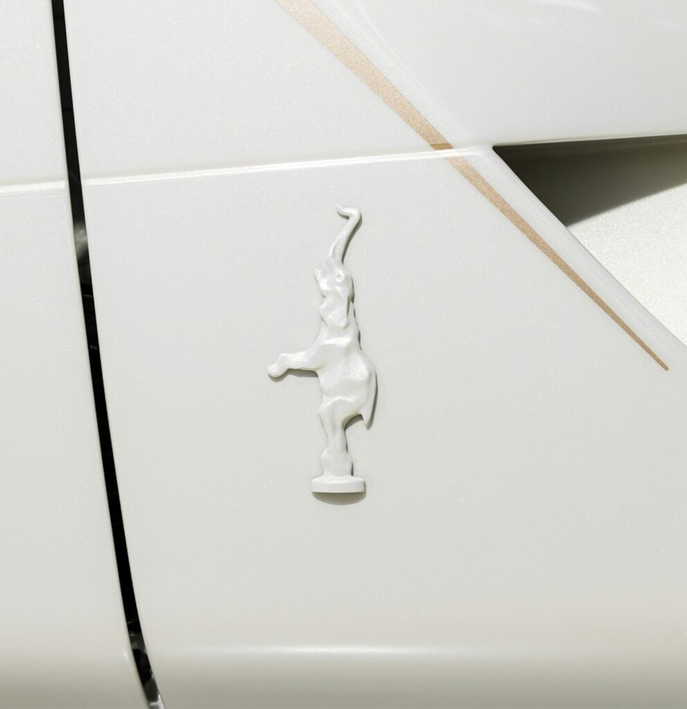 The cabin of “La Perle Rare” is an extension of its exterior artistry — a sanctuary finished in pristine white leather, accented by delicate golden linework that traces the architecture of the interior. The flowing patterns echo the body’s movement, creating cohesion between exterior and cockpit.