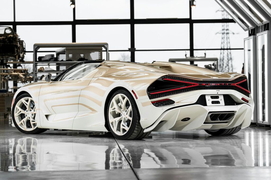 The exterior is a symphony of light. A bespoke pearlescent white interacts with warm golden accents in a fluid composition that feels alive under natural sunlight. The paintwork alone required painstaking manual application, with artisans dedicating hundreds of hours to achieve seamless transitions and flawless depth. The effect is sculptural — a body that seems carved from luminous stone rather than formed from carbon fiber.