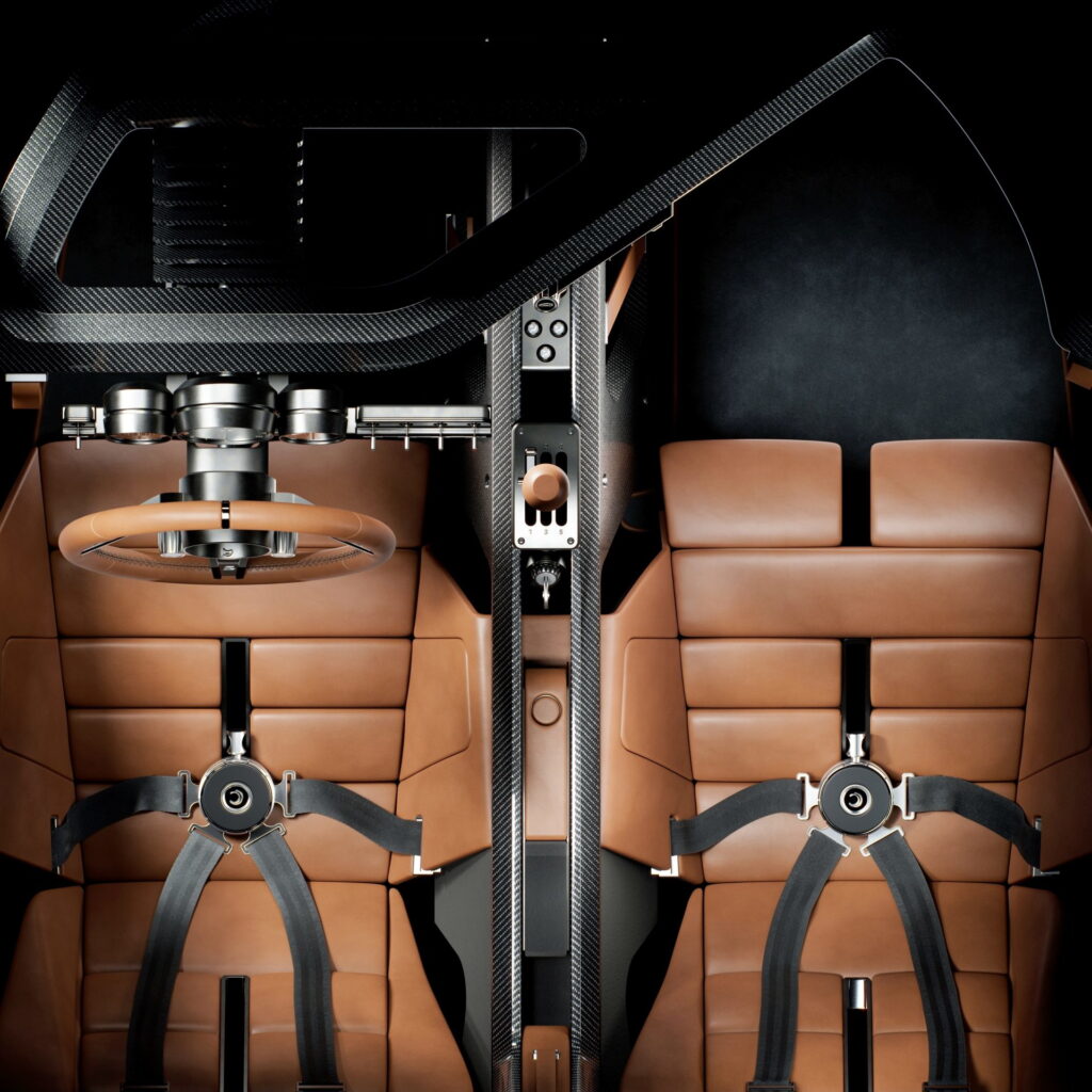 The cockpit avoids the screen saturation typical of modern hypercars. Instead, the environment is curated around tactile engagement and visual elegance.