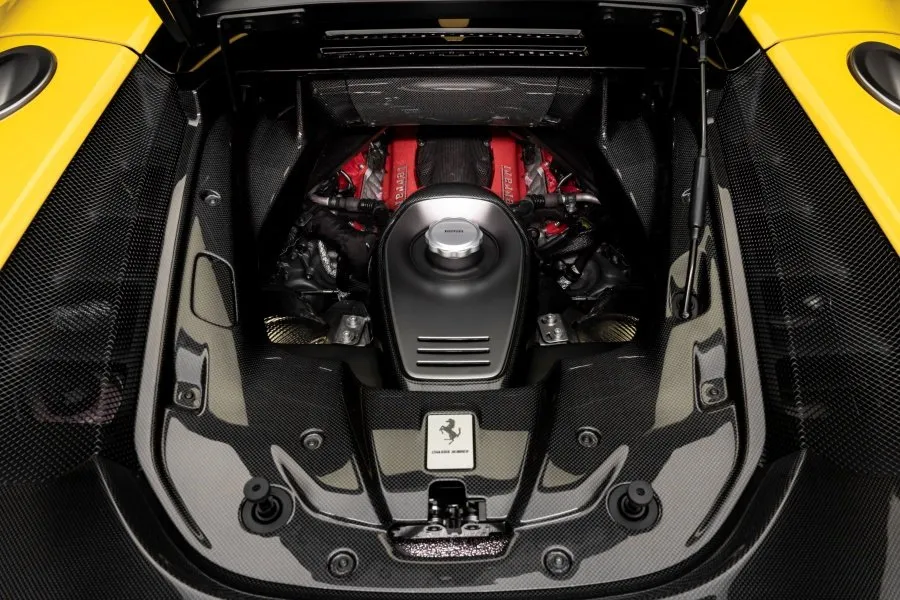 The Ferrari 849 Testarossa is powered by a rear mid-mounted 3,990 cc twin-turbo V8 (internal code F154FC) producing 830 hp and 842 Nm of torque. This extensively reengineered unit features revised intercoolers, optimized intake chambers, upgraded turbochargers and Inconel exhaust manifolds designed to enhance both performance and acoustic character.