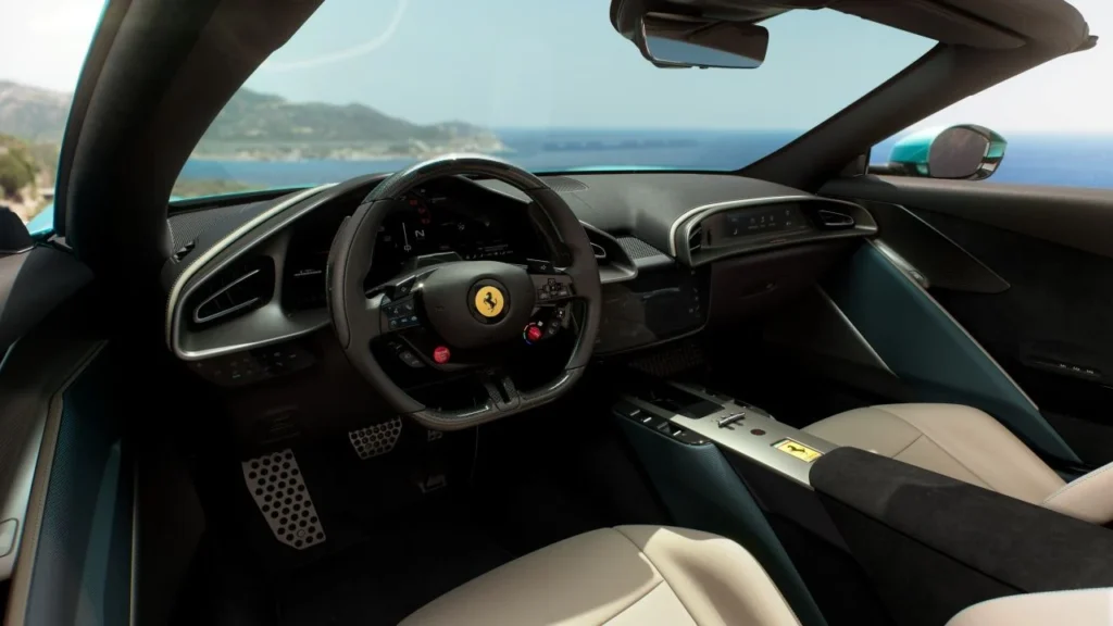 Inside, the Amalfi Spider showcases Ferrari’s modern approach to cockpit design.