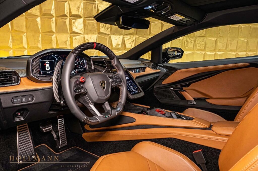 The Nero Ade exterior is paired with a Terra Kedros interior, creating a warm yet technical contrast. Alcantara roof lining, carbon kickplates with illuminated logos, and finely detailed stitching reflect Lamborghini’s Ad Personam customization program.