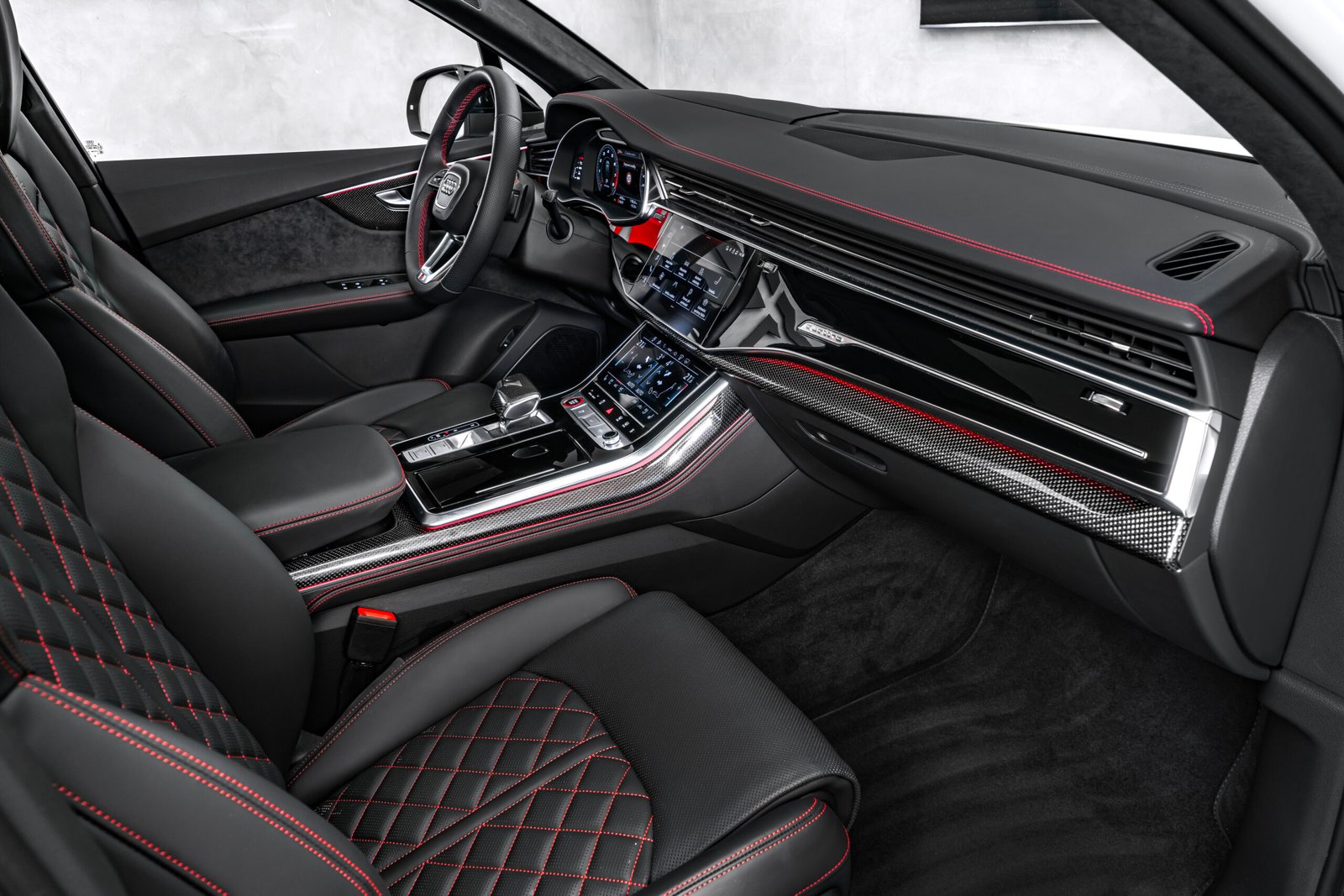 Inside, the cabin exudes sophistication with Valcona leather upholstery, red contrast stitching, diamond-quilted S sport seats, Alcantara rooflining, and ambient contour lighting. Equipped with top-tier options including head-up display, panoramic roof, ventilated front seats, B&O sound system, and the Assistance Package Plus, this SQ7 is as confident on long journeys as it is dynamic on winding roads.