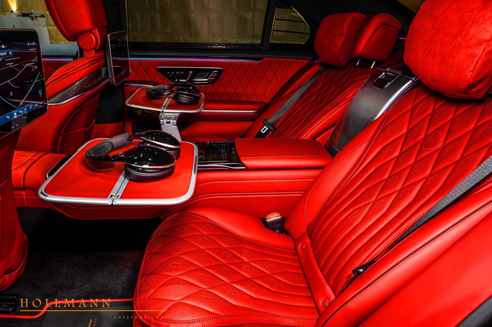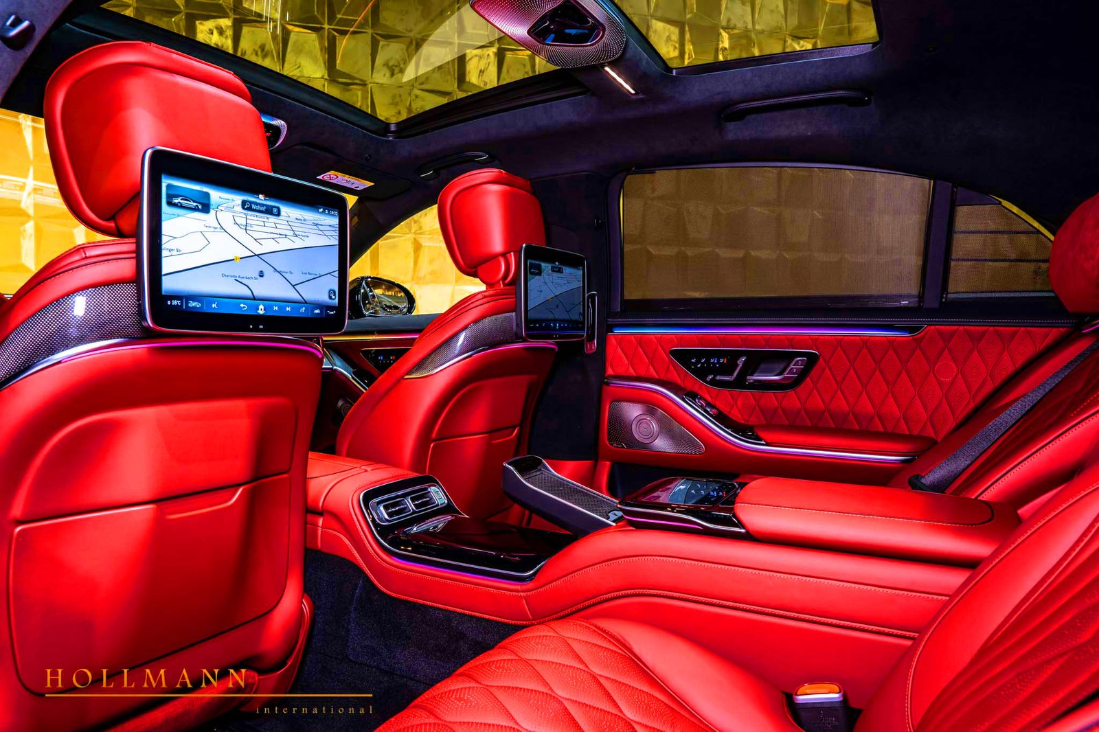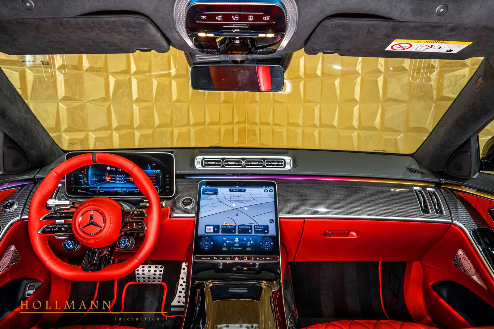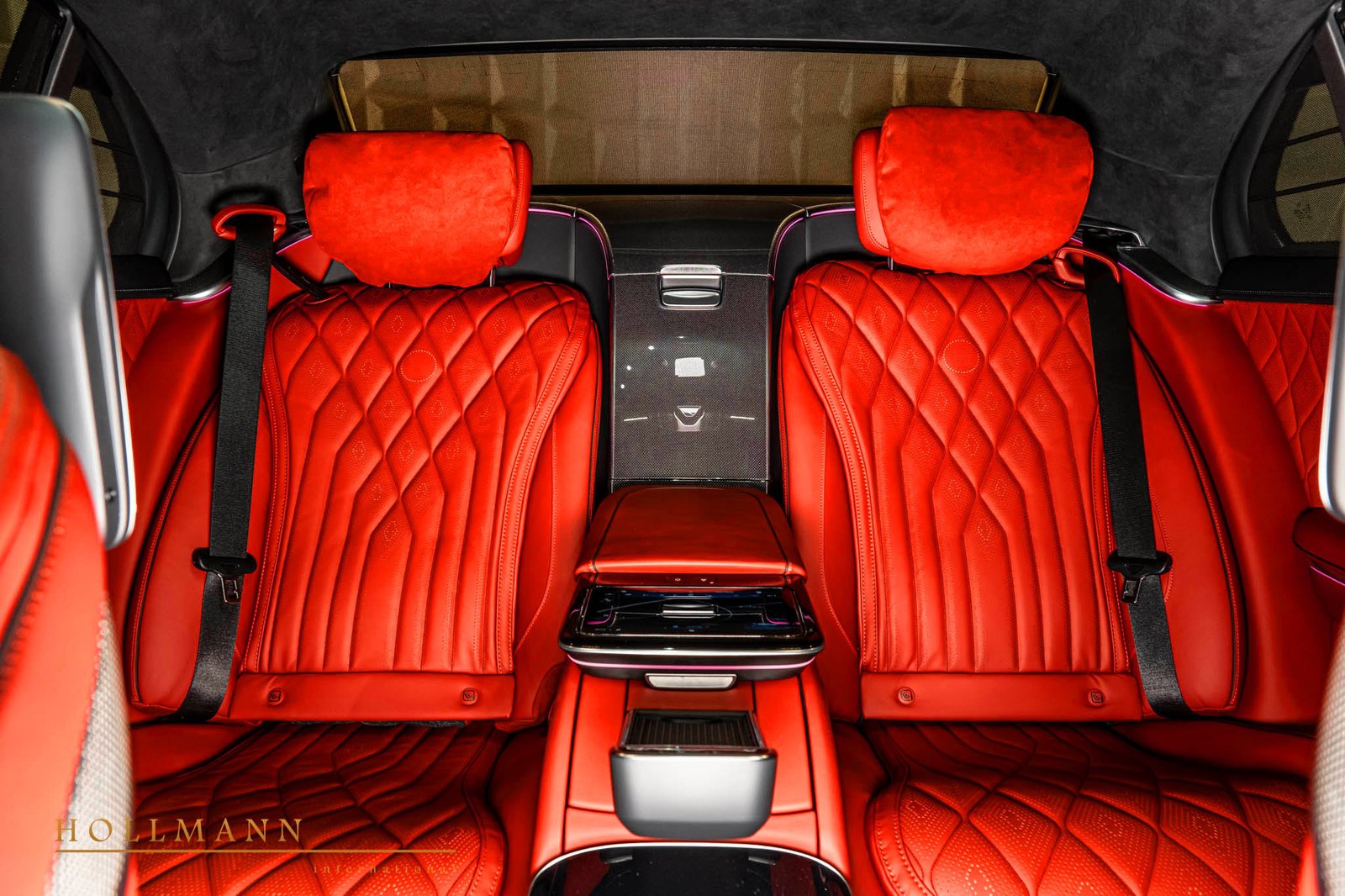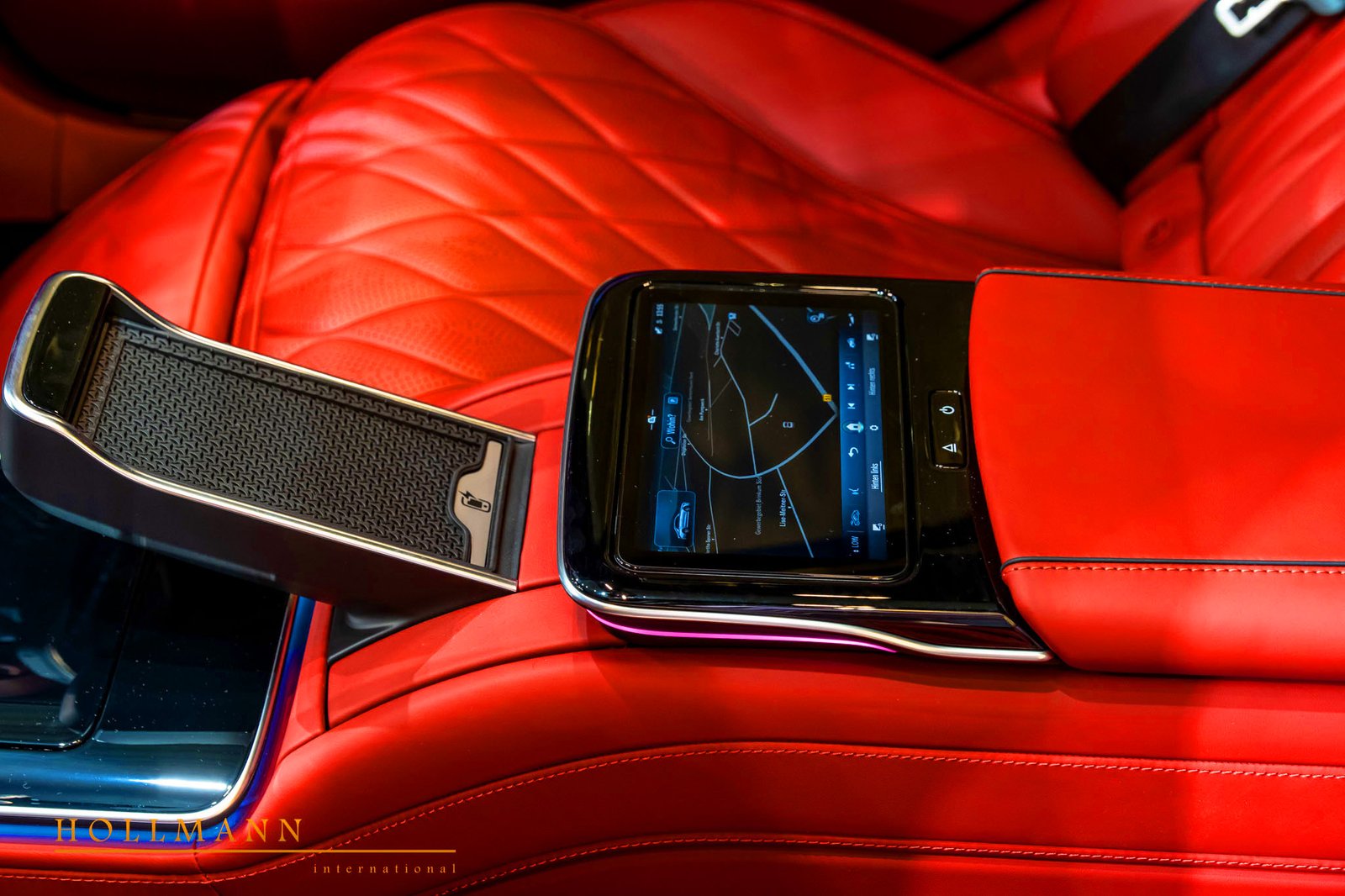 Designed for rear-seat excellence, it includes the Chauffeur Package, multicontour climate seats with massage, folding tables, rear neck warmers, calf massage, individual rear entertainment with touchscreen, and a refrigerated compartment. The cockpit is no less spectacular: dynamic front seats, MBUX Navigation Premium, augmented reality, Burmester Premium sound, ambient lighting, fingerprint scanner, and BRABUS carbon trim throughout.