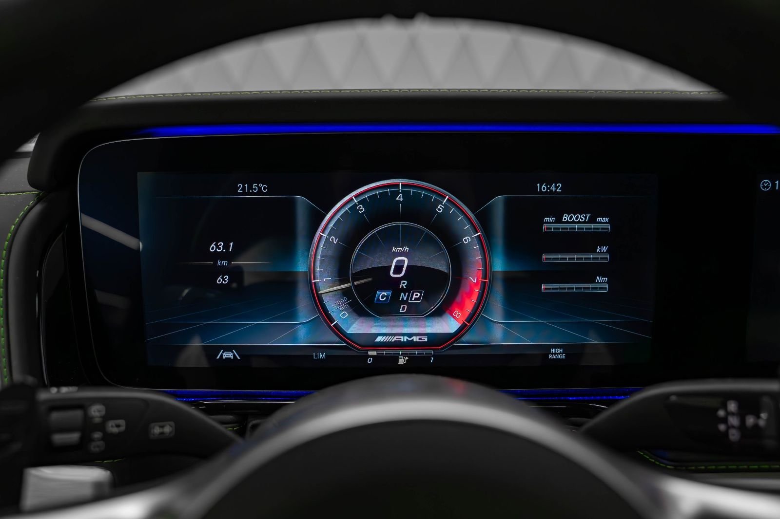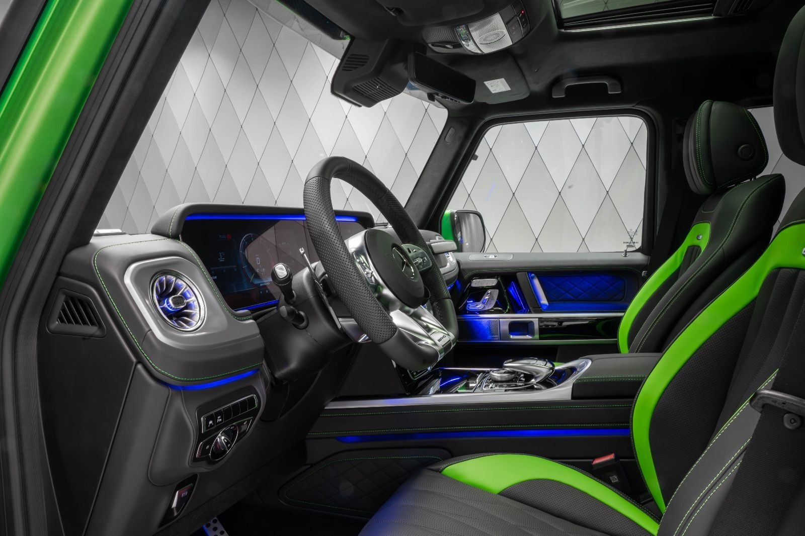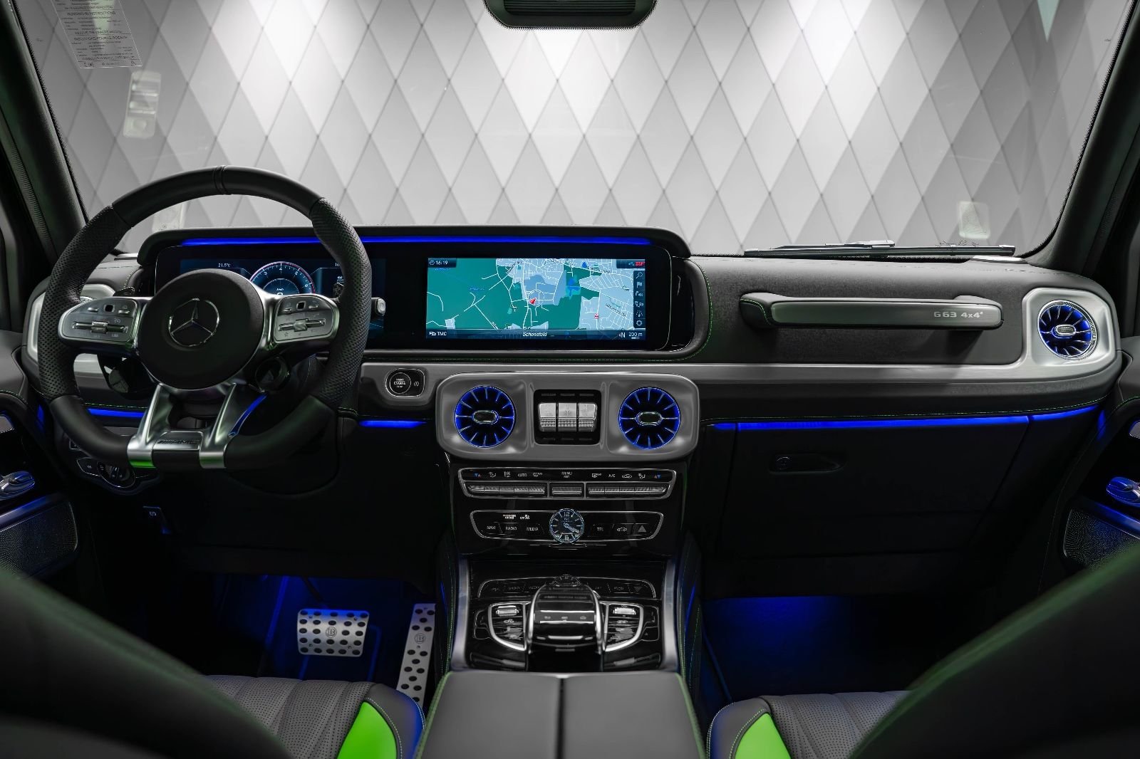 Inside, the cabin features black Nappa leather with lime green accents, ambient lighting in 64 colors, a digital rearview mirror, Energizing Comfort programs, and the Superior Line interior package. Comfort and tech highlights include Burmester sound, COMAND Online navigation, Apple CarPlay/Android Auto, TV tuner, 360° camera, massage seats, lane assist, blind spot monitoring, and a microfibre headliner. This is one of the most complete and exclusive G-Wagens available today.
