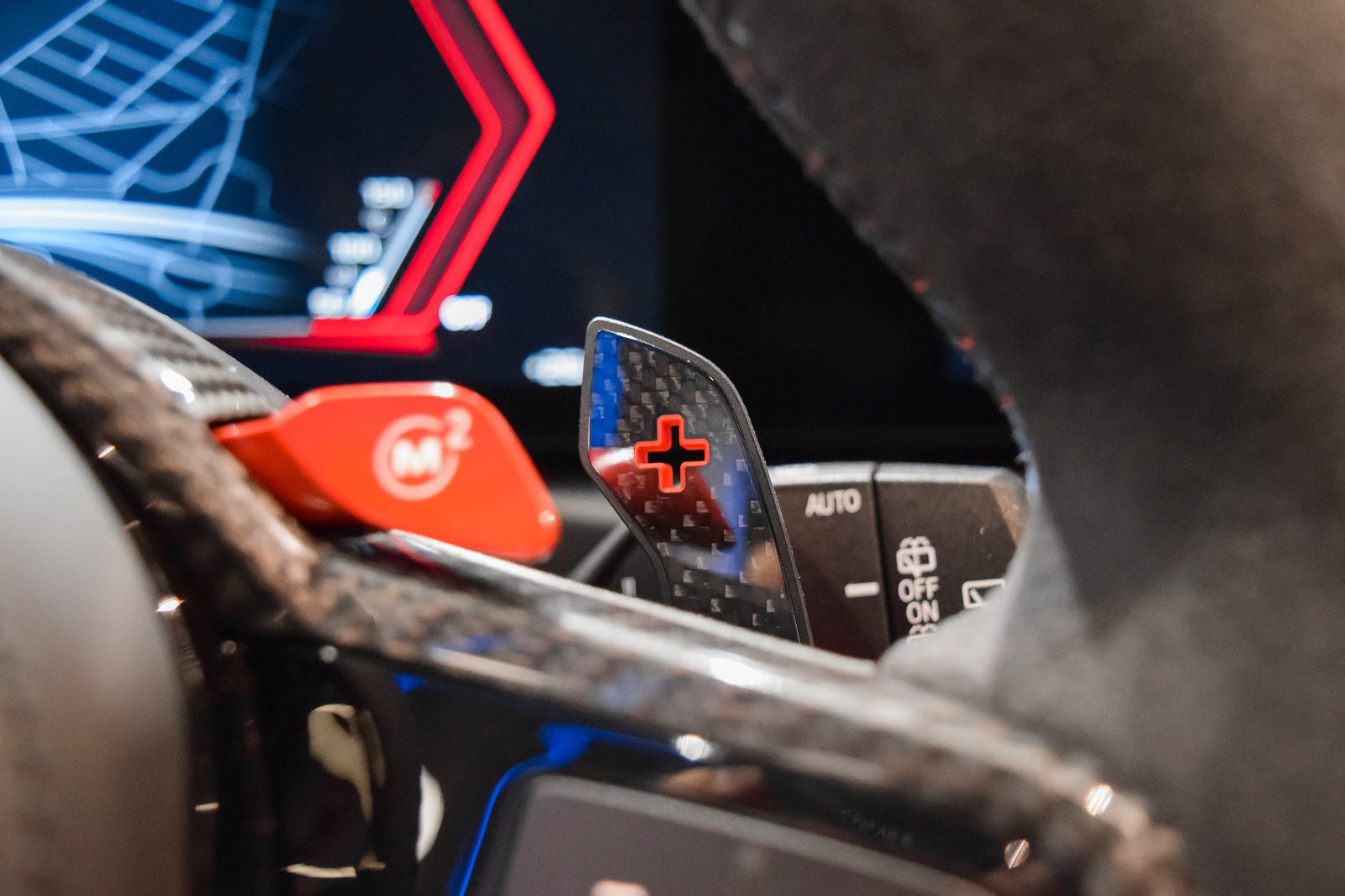 Inside, the cabin wraps you in Full Merino leather in Anthracite, complemented by M Carbon bucket seats, Alcantara M steering wheel, and carbon-fibre interior trim — the perfect balance between lightweight sportiness and luxury refinement.
