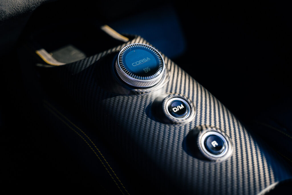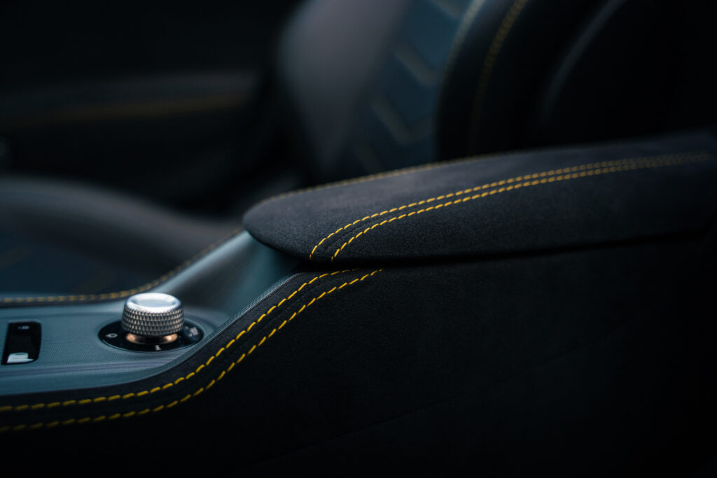 Black and yellow accents complement the exterior color, while materials such as leather, Alcantara, and carbon fiber create a premium yet technical environment.