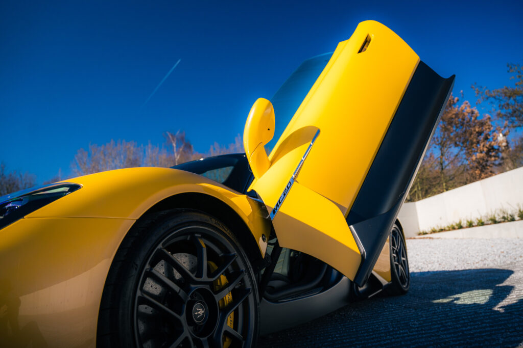The signature butterfly doors are not only visually striking but also functional, allowing easier access to the minimalist cockpit.