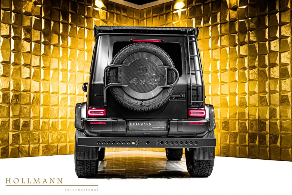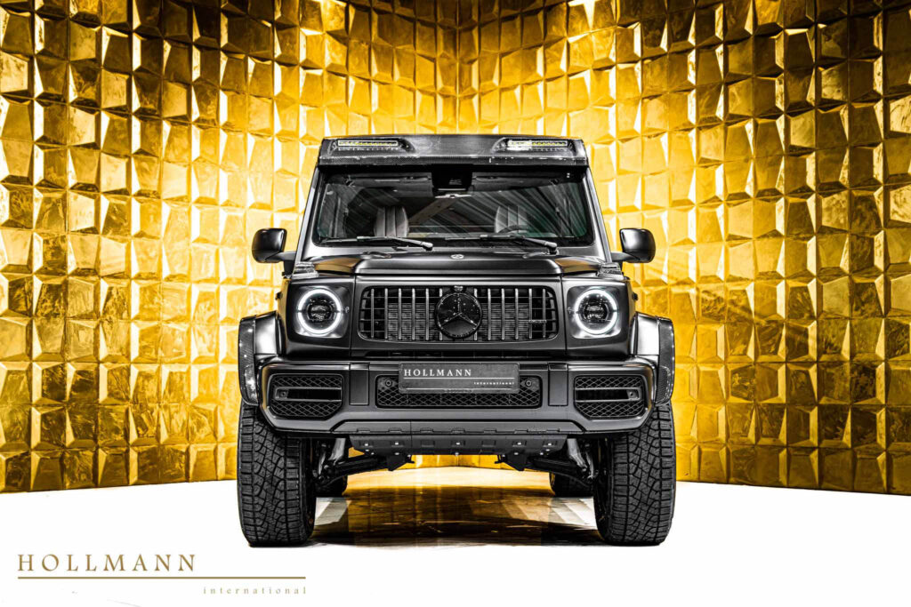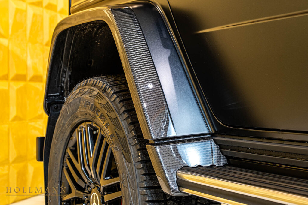 Large 22-inch AMG multi-spoke wheels fill the widened arches, emphasizing the SUV’s imposing stance. Stainless steel running boards, protective skid elements and carbon details contribute to a design that feels both rugged and refined.