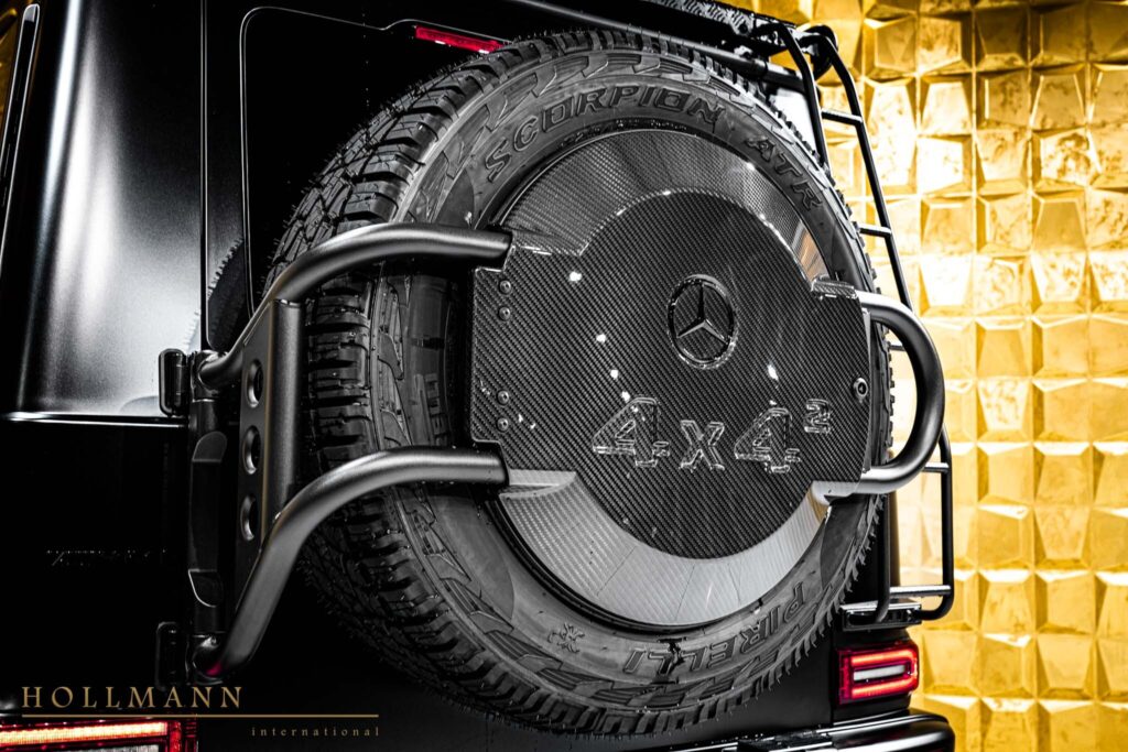 The rear spare wheel carrier remains one of the G-Class’s most recognizable features, reinforcing the vehicle’s heritage as a true off-road machine.
