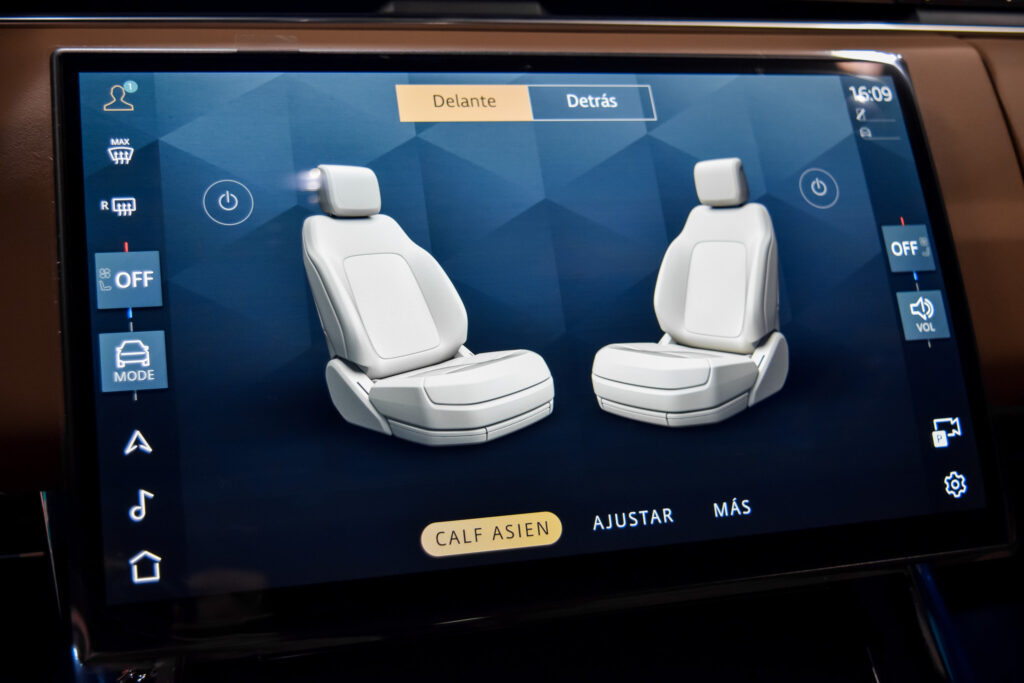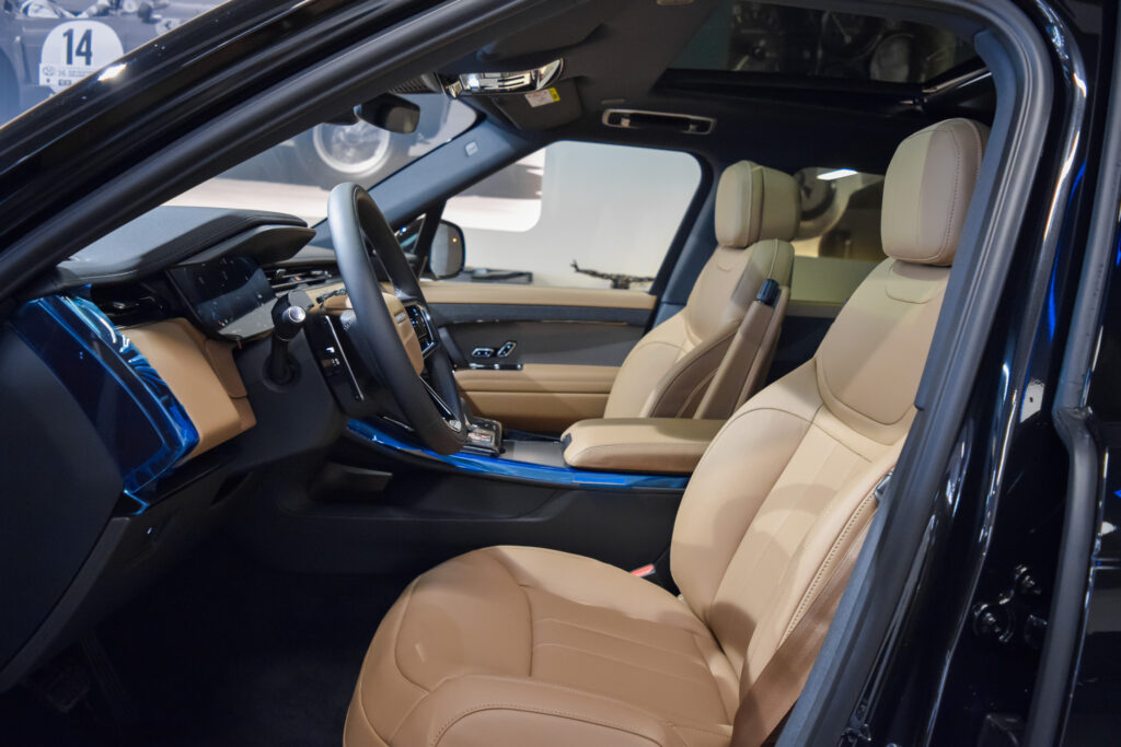 Perforated Windsor leather seats in Caraway provide a warm and inviting atmosphere, complemented by Ebony headlining and brushed aluminium trim. The seating configuration offers both comfort and versatility, with electrically adjustable front seats and reclining rear seats.