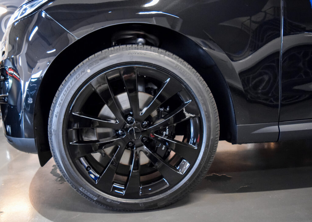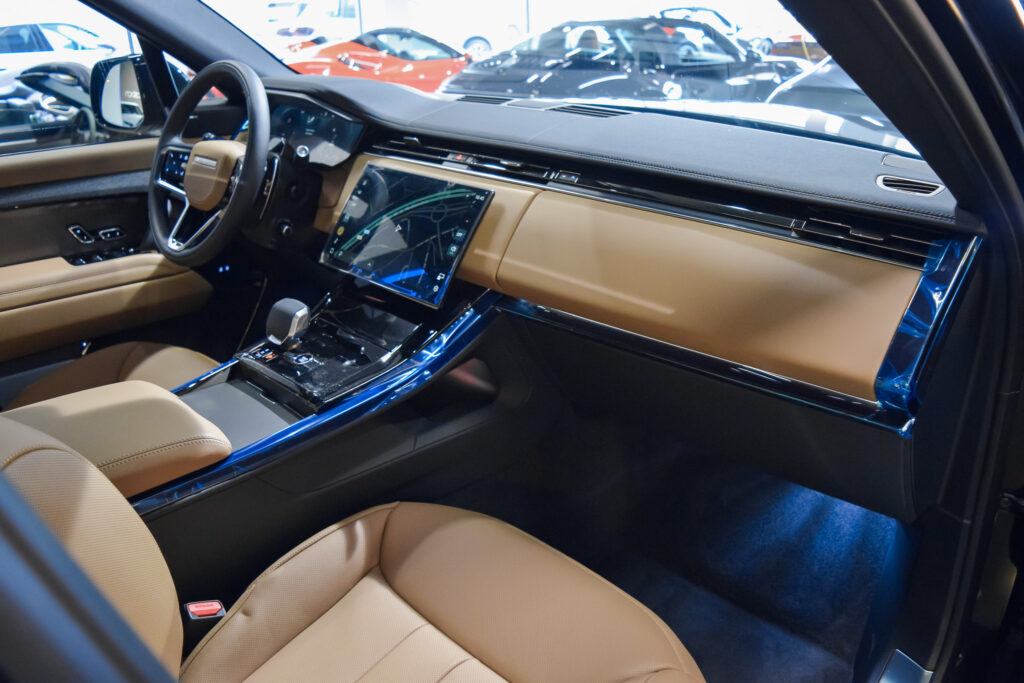 Finished in Santorini Black, this example adopts a clean, understated aesthetic enhanced by privacy glass and 23-inch gloss black wheels. The panoramic glass roof adds both visual lightness and interior brightness, while the LED lighting signature reinforces the vehicle’s modern character.
